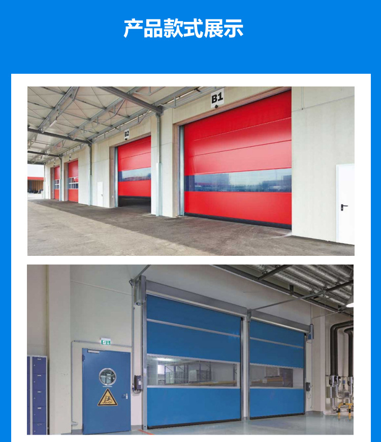 快速門采用高強(qiáng)度抗氧化鋁合金門框符合6063-T6標(biāo)準(zhǔn),冷扎板靜電噴涂門罩、機(jī)箱。進(jìn)口高密度聚脂纖維表面鍍膜處理,厚度0.8mm-1.5mm,顏色可選擇。