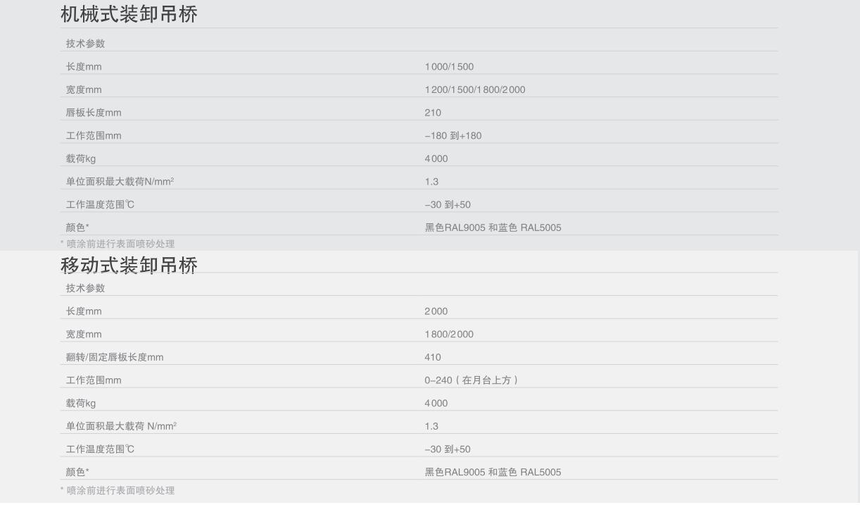 機(jī)械式裝卸吊橋安裝在開放式月臺(tái)上,可以彌補(bǔ)月臺(tái)與卡車尾箱的高度差,最大可達(dá)360mm,適用于車用高度與月臺(tái)高度差在此范圍內(nèi)的裝卸貨車輛。工作時(shí),通過側(cè)面的把手將機(jī)械式吊橋放下直至與裝卸貨車輛車用完全搭接。裝卸貨完成之后,將吊橋回復(fù)到起始位置。機(jī)械式吊橋具有固定式和滑動(dòng)式兩種結(jié)構(gòu)。帶有滑動(dòng)結(jié)構(gòu)的裝卸貨吊橋,可以沿著導(dǎo)軌移動(dòng)到月臺(tái)的不同位置工作。